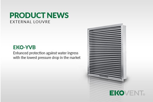 EKO-YVB is a new external louvre providing excellent protection against water ingress. The louvre has been tested according to EN13030:2001, achieving 97% water separation (Class B) at a face velocity of 2 m/s. Additionally, EKO-YVB features a patented design ensuring very low pressure drop and noise values.Manufactured as standard in ZincMagnesium ZM120 with Corrosivity Class C4. It can also be produced in various special materials, such as recycled steel ZM310 (RRP) with Corrosivity Class C5.
