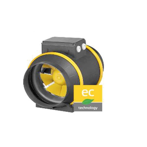 Duct fan EKO-EM features a diagonal impeller with downward-oriented three-dimensional guide vanes and a plastic casing. It is equipped with an AC motor for variable speed control and an integrated thermal contact.