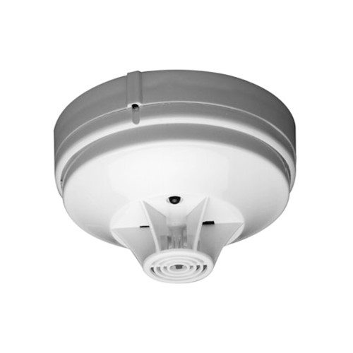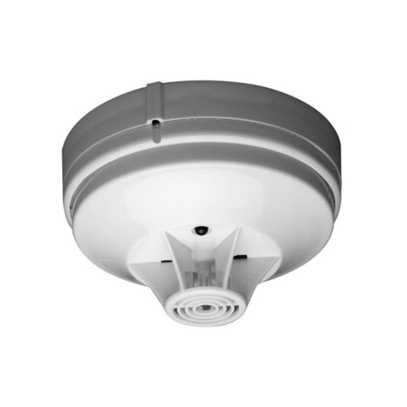 The heat detector is a low-profile detector, where the heat-sensitive element has low thermal mass, providing very rapid indication of temperature increases. The detector is of maximum type, meaning it triggers an alarm when the temperature reaches 54 °C. It is very fast and can therefore be advantageously used where a combination of maximum and differential heat detection is desired. When the temperature reaches 54 °C, the detector alarms and the red lamp lights up. The detector is also available in 84 °C version.