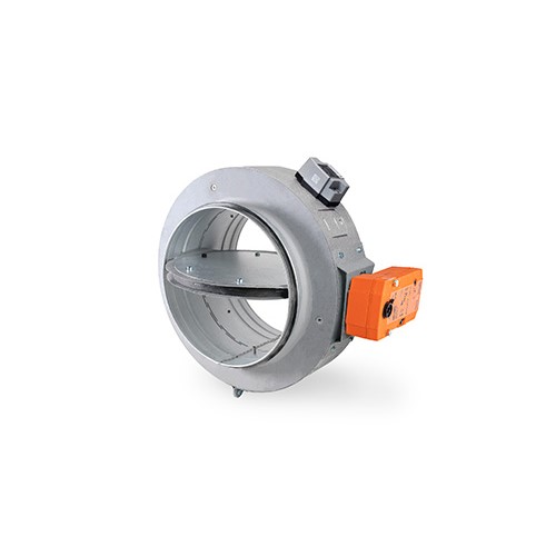 Spjället är försett med fabriksmonterat elektriskt ställdon med fjäderåtergång, ändläges kontakter och termisk sensor.
